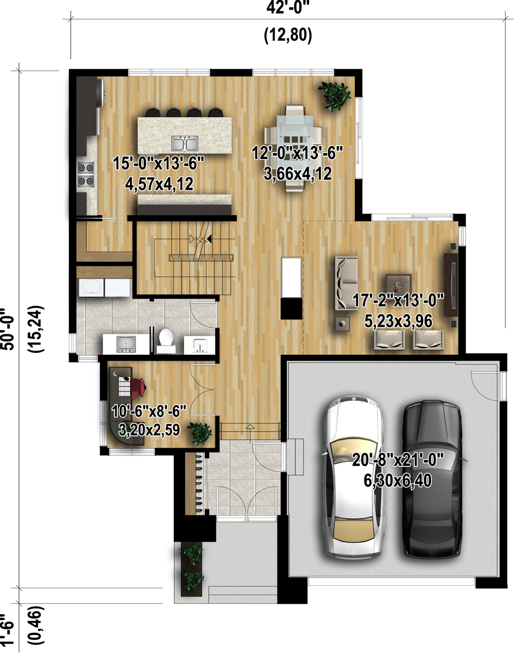 A stunning two-storey house. The house is 42 feet wide by 50 feet deep and provides a 2,370 square-foot living area, in addition to a 474 square-foot two-car garage. The ground floor provides 1,155 square feet of living space and includes a small office located next to the sunken entrance hall, a two-storey high living room with a three-faced gas fireplace, a dining room located next to a kitchen with a large pantry and a huge island that can sit four people, as well as a powder room with a direct access to the laundry room. Offering a 1,215 square foot living area, the upper floor features a family bathroom and three bedrooms, including a master bedroom with a private terrace, a large walk-in closet and a private bathroom with a double vanity, a freestanding bathtub and a separate shower. |